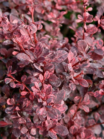 Листья красно-пурпурные с серыми и белыми пятнами и разводами, к концу сезона становятся коричнево-красными, осенью — карминово-красные.