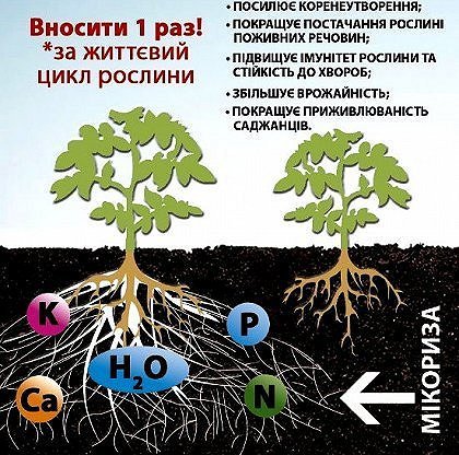 MikoLife - унікальний біопрепарат, який складається із спор мікроорганізмів сімейства Glomus mossaea, які утворюють симбіоз коріння рослини (з'єднуються з грибним міцелієм), завдяки чому значно підвищується площа поглинання вологи рослиною з розчинними в ній поживними речовинами.