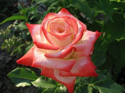 Очень ароматный сорт, но это с лихвой компенсируется высоким контрастом и сочетанием цветов бутона. Кусты сильнорослые, прямостоячие, высотой до 100-120 см, листья крупные блестящие, обладают высокой устойчивостью к болезням, впечатляют крупные махровые цветы диаметром до 13 см.Отличная зимостойкость сорта.