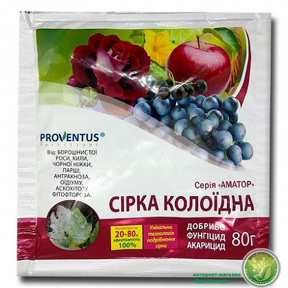 Сера коллоидная ( фунгицид) - для защиты плодовых, овощных, цветочных культур и винограда от мучнистой росы, килы, парши, оидуума, антракноза, аскохитоза и растительных клещей. Обладает профилактическими и лечебными свойствами, предупреждает и подавляет многие болезни.