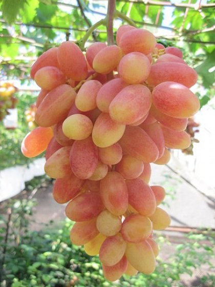 Ливия - столовая гибридная форма винограда сверхраннего срока созревания. Коронка молодого побега светло-зелёная, без опушения. Первый лист практически цельный, остальные – пятилопастные, средне-рассечённые. Черешковая выемка открытая. Однолетний вызревший побег светло–коричневого цвета. Цветок обоеполый. Гроздь крупная, длиной 25 см и более, цилиндрическая, средне-рыхлая. Некоторые грозди ветвистые. Ягода в грозди - от овальной до яйцевидной формы. Длина ягоды 28 мм и более, ширина 18–20 мм. Окрас ягоды – розовый. Мякоть мясисто–сочная, с мускатным ароматом и высоким сахаронакоплением. Кожица при еде не ощущается. В ягодах 1–3 семени, легко отделяющихся от мякоти.