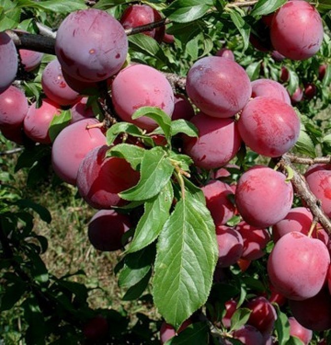 Плоды среднего срока созревания, крупные (30-35 г), округло-овальные. Кожица темно-красная, матовая, с небольшим восковым налетом. Мякоть ярко-желтая, сочная, кисло-сладкая. Косточка не отделяется.