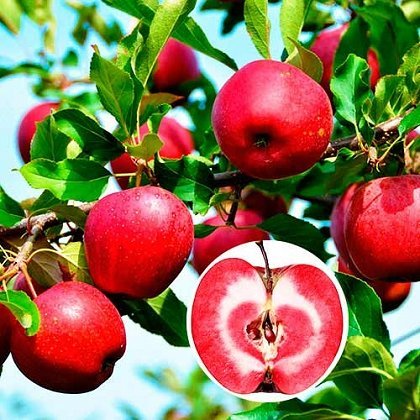 Имеет блестящую темно-вишневую кору, при срезе древесина насыщенно-розовая. Цветет темно-малиновым цветом. Листья с красным отливом. Изюминкой сорта является красная мякоть плодов. Сорт Эра — раннезимний.