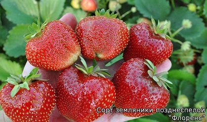Флоренс (Florence). Сорт образует малое количество ус. Плоды крупные и очень крупные, конической формы, темно-красного цвета с сильным блеском и воздушной ячейкой среднего размера. Ягоды имеют мякоть, умеренной плотности, красный как на периферии так и внутри, приятного сладкого вкуса. Сорт достаточно устойчив к таким болезням как вертицилезу, фитофтора и мучнистая роса.