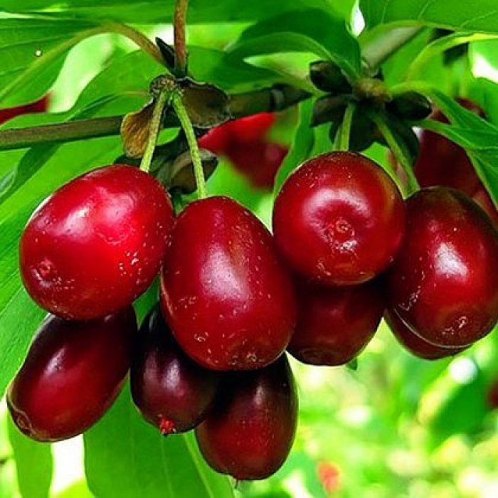 Кизил Владимирский. Крупноплодный сорт среднего срока созревания, плодоношение кизил вступает на 4 - 5 год. Начало созревания (15 - 20 августа). Дерево среднерослые, средне разветвленные. Плоды кизила овальной формы, созревают одновременно. При созревании набирают тёмно-бордовый, практически чёрный цвет. Плоды крупные средняя масса – 8 -10 гр. Мякоть красная, плотная, высоких вкусовых качеств. Косточка среднего размера, узкоэллиптические. Сорт зимостойкий, засухоустойчивый.