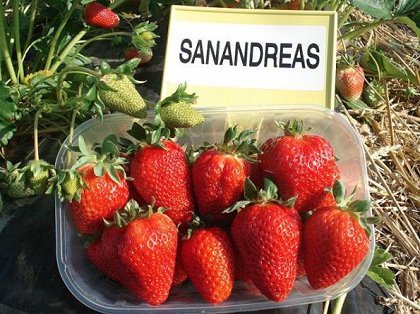 Клубника «Сан Андреас» выведена в Калифорнии. Относится к сортам нейтрального дня, то есть созревание ягод не зависит от длины светового дня и куст плодоносит постоянно с начала июня и до заморозков. В условиях Украины может плодоносить до четырех раз. По основным показателям похожа на популярный Альбион, но отличается более высокой урожайностью. Транспортабельность высокая. Ягоды красные, глянцевые, конической формы, равномерные с прекрасным ароматом. Ягоды оранжево-красные изнутри, крупные, средний вес 25-30 г, а отдельные достигают до 50 г. Вкус ягод замечательный, насыщенный сладкий. Куст среднерослый, компактный, средней загущенности, образование усов слабое. Лист светло-зеленый. Лучше растет на плодородных, рыхлых грунтах. Устойчивость к болезням высокая, хорошая устойчивость к неблагоприятным факторам. Сорт подходит для выращивания в закрытом и открытом грунте, как для личных нужд, так и для продажи.