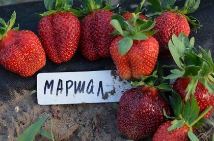 Клубника Маршал – один из излюбленных сортов многих садоводов, который считается очень выгодным. Созревание среднее – в начале июня. Плоды крупные (до 90 г), конической привлекательной формы, очень ароматные и невероятно вкусные. Отличается хорошей переносимостью сильных морозов и засухи. Мощные кусты.