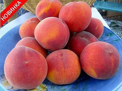 Плоды крупные, массой 180 - 220 г и крупнее, округлой или слегка удлинённой формы, желтой окраски, с небольшим красным румянцем. Мякоть плотная, сочная, отличается высокими вкусовыми качествами (дегустационная оценка 5 балов), ярко желтой окраски. Запах очень ароматный. Опушенность плодов не большая.