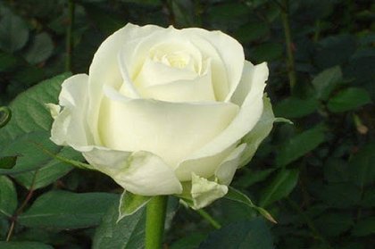 Белые, средне-махровые (17-25 лепестков) цветки, в полуроспуске - классической формы чайно-гибридной розы с высоким центром, в полном роспуске - свободной, открытой чашевидной формы, могут показывать серединку, на побегах - одиночные. Куст вертикальный, со средне-зеленой, матовой листвой.