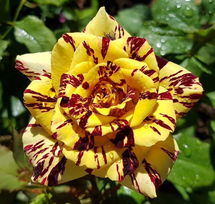 Лимонные лепестки усыпаны чёрно-бордовыми бархатистыми полосами, разводами, брызгами.