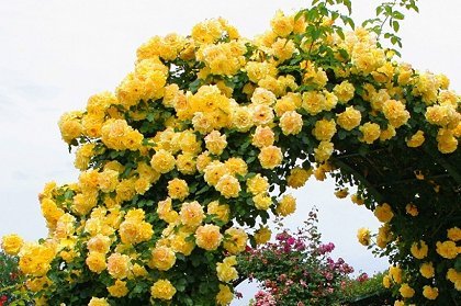 Цветки желтые, крупные ( 10 см в диаметре), махровые (до 40 лепестков), слегка чашевидные, с красными кончиками и красивыми золотистыми тычинками в центре. Цветки вначале ярко-желтые, затем выгорают до лимонных, а потом и до кремовых. Они появляются в кистях по 5-15 шт.