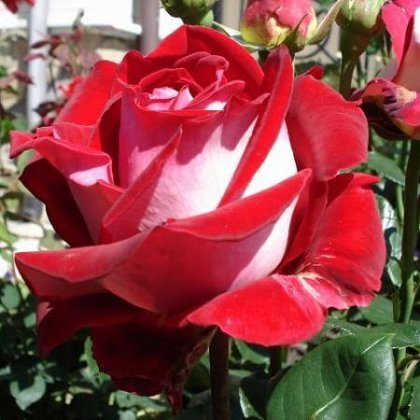 Цвет биколор - снаружи белый, внутри красный. Высота куста 80-100 см.