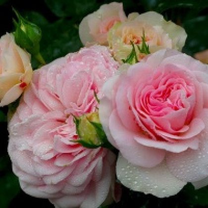 Роза Mariatheresia - очаровательная ветвистая флорибунда с ностальгической формы чашевидными цветками. Запах легкий, очень нежный. Лепестки переливающиеся, с нежными переходами оттенков от жемчужно-розового к кремово-сливочному. Цветет очень обильно, цветы средних размеров (7-8 см в диаметре), появляются в довольно больших кистях до 6-8 штук. Соцветия покрывают весь куст все лето, до самых заморозков. Роза не боится ни жары, ни дождливой погоды. Куст невысокий, аккуратный, около 60-80 см в высоту и 50 см в ширину, с блестящей темно-зеленой листвой. Устойчивость к болезням высокая.