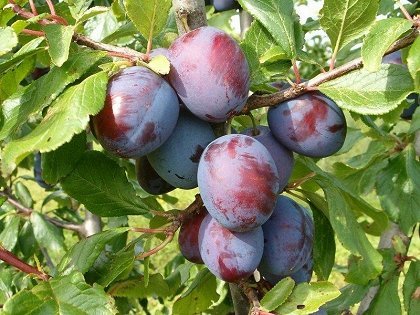 Плоды крупные 50-60 гр, имеют овальную, слегка сплющенную форму, цвет кожицы бордовый или фиолетовый, она покрыта восковым налетом. Мякоть оранжевая или желтая, вкусная, плотная, хорошо отделяется от косточки. Созревшие плоды осыпаются в начале сентября.