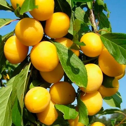 Слива колоноподібна "Жовта" - це невисоке дерево досягає приблизно 1,5-2 метри заввишки і не займає багато місця в саду. У неї вузька крона, а також досить міцний стовбур. Плід цього сорту, а точніше його шкіра забарвлена в рожево-фіолетовий колір, а ось м'якуш жовтий і має невелику кислинку до смаку. Важить один плід приблизно 50-70 г. Стійкість до морозів: висока Стійкість до захворювань: висока. Запилювачі: самоплідний. Термін дозрівання: ранній. Дозрівання плоду: червень