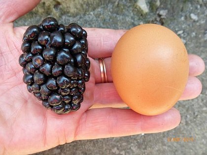 Ягода черного цвета, вкусная, очень крупная (средний вес ягод 12 г, самые крупные ягоды до 28г). В течении растянутого плодоношения (6 недель) ягода остается крупной. Ягода с хорошими транспортабельными качествами. Ягода у Киовы – одна из самых крупных среди всех сортов ежевики.