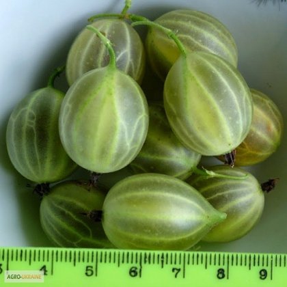 Ягоды средние или крупные (4,2-7,5 г), одномерные, округло-овальные, зеленые, с тонкой кожицей. Вкус отличный, сладкий и кисло-сладкий, оценка 5 баллов. Чашечка средняя, полуоткрытая.