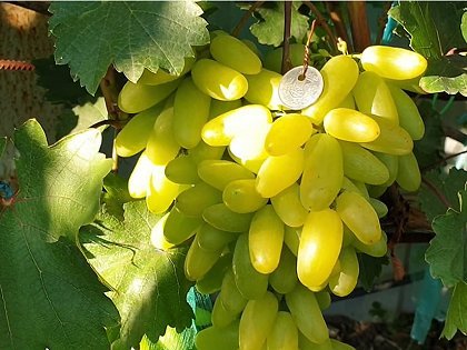 Одна из самых интересных новинок, столовая гибридная форма винограда Мальчик с пальчик, выведен селекционером любителем, форма из коллекции Калугина Виктора Михайловича. характеризуется ранним сроком созревания в условиях юга Украины (100 - 105 дней). Куст с побегами большой силы роста. Лоза вызревает хорошо. Цветок обоеполый. Листья большие округлые, без лопастей. Грозди крупные, ветвистые, средней плотности, массой 700 - 1100 грамм. Ягоды очень крупные, вытянутой формы, пальчиковые, размером 18х54 мм, массой 17-22 г. Кожица ягод средней толщины, жёлтого цвета. Мякоть сладкая, плотная хрустящая, хорошего сортового вкуса. Морозостойкость, устойчивость к заболеваниям высокая.