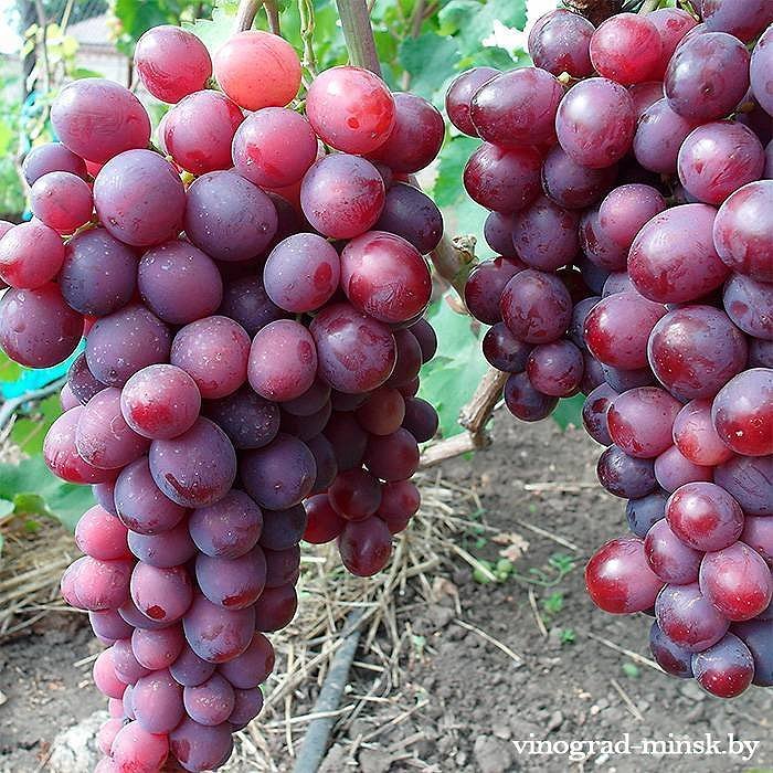 Ягода очень крупная, овальной формы, темно-красного или фиолетового цвета, покрыта пруиновым налетом. Особенно красивы, если стереть пруин. Если сравнивать еще с одной похожей новинкой Заря Несвестая, то здесь не так выражен мускат, зато грозди не настолько плотные, что мне больше импонирует. Вес отдельных ягод может достигать до 16 грамм. Мякоть плотная и хрустящая. Иногда наблюдается треск ягод после затяжного дождика.