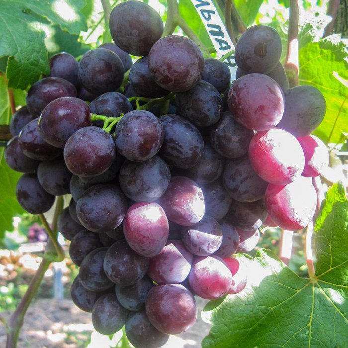 Ягода крупная, овальной или округлой формы, весом 10-14 грамм, мякоть мясистая с подхрустом. Во вкусе мускат не ярко выражен, но он чувствуется сразу. Окрас ягод при созревании от малиново-красного до бордового оттенка.