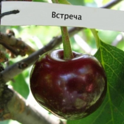 Встреча - самый популярный сорт вишни, высоко оценён садоводами благодаря слабо-рослой форме дерева, очень крупными плодами. Вишня среднего срока созревания, 20 - 25 июня. Цветение с 26 апреля по 5 мая. Дерево среднего не высокое вырастает до 2.5 м высотой. Крона шаровидная, красивая, густая.