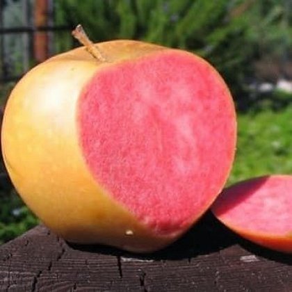 Новый сорт красномясой яблони Пинк Перл ( Pink Pearl ) - отличается превосходными вкусовыми качествами, привлекательным внешним товарным видом - золотистая плотная кожица, насыщенно розовая сочная мякоть.