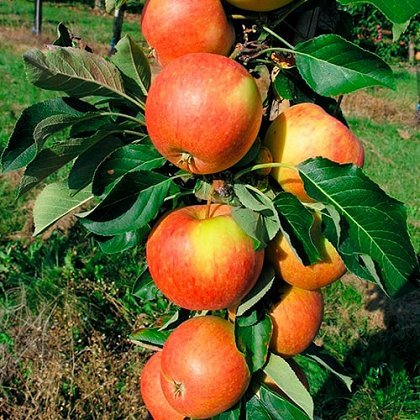 Яблуня колоноподібна "Тріумф" - це сорт, який відноситься до напівкарликових різновидів. Висота дорослої яблуні не перевищує 2-х метрів, за нею дуже легко доглядати, що робить цей різновид ще популярнішим. Дерево рясно плодоносить, а яблука відрізняються відмінними смаковими якостями. Висота яблуні 2 м, ширина крони до 50 см, гілки щільно прилягають до ствола. Яблука середнього розміру, вагою до 150 г, шкірка середньої щільності, глянсова, рівна, зелено-жовта, покрита насиченим рум'янцем. врожайність: до 9 кг з дерева, при гарному догляді можна збільшити кількість яблук у 2 рази; смак: м'якоть білого кольору, дуже соковита, смачна, у смаку переважає насолода, є приємні нотки кислинка та чудовий медовий післясмак; термін дозрівання: початок вересня; запилення: сорт самоплідний; зона посадки: сонячна ділянка без протягу; морозостійкість: середня, яблуня при тривалих заморозках потребує додаткового укриття; хворобостійкість: висока; призначення для використання: універсальне, плоди вживають свіжими, переробляють; лежкість: хороша, до 3-6 місяців за дотримання умов зберігання; транспортабельність: хороша, м'якоть щільна, при перевезенні не ушкоджується; умови посадки: саджанці плодових яблунь висадіть у квітні або на початку жовтня, виберіть родючий, легкий ґрунт, до посадкової ями додайте добрива, поставте кілочок у центрі як опору, приствольне коло замульчуйте; обрізка: щорічно проводьте санітарне чищення, укорочуйте бічні гілки.