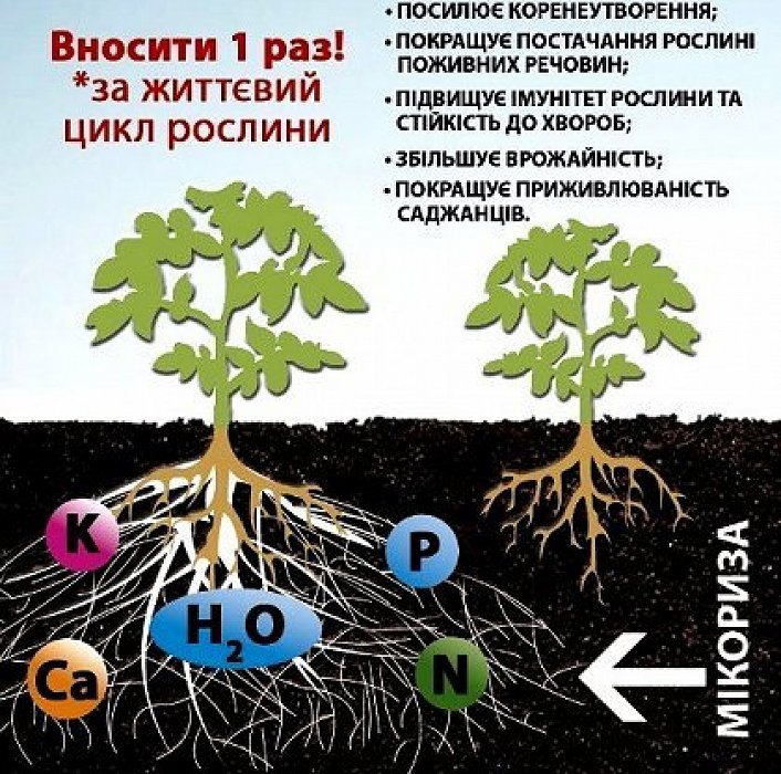 MikoLife - унікальний біопрепарат, який складається із спор мікроорганізмів сімейства Glomus mossaea, які утворюють симбіоз коріння рослини (з'єднуються з грибним міцелієм), завдяки чому значно підвищується площа поглинання вологи рослиною з розчинними в ній поживними речовинами.